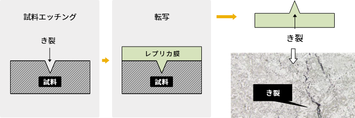 レプリカ観察では、レプリカ上で欠陥そのものや欠陥周囲状況の変化点や特異な部分を認識し、その状況を客観的に分かりやすい適切な倍率で写真撮影します。欠陥発生原因の調査であれば、それを裏付ける部分を観察します。